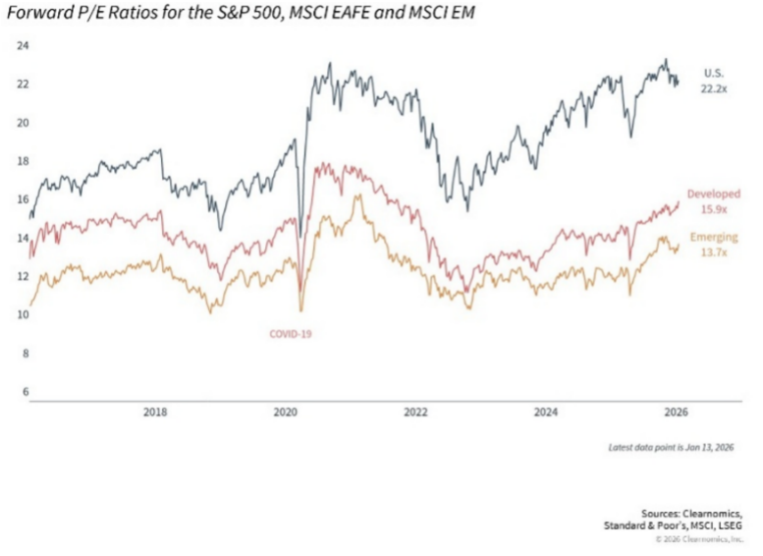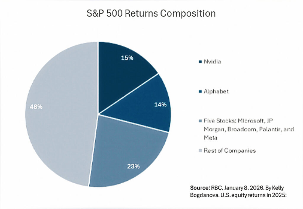 Concentration of Returns: The “Magnificent 7” (Nvidia, Tesla, Alphabet, Meta, Amazon, Microsoft, and Apple) continue to be an incredibly large and important piece of global equity indices. Interestingly, in 2025 the S&P 500 once again delivered robust performance driven by seven companies, but there were a few new drivers, including: JP Morgan, Broadcom and Palantir. Palantir trading at 185x earnings will not be commented on here.
